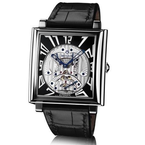 Milus Watches Herios TriRetrograde Automatic Men's Wristwatch Black Alligator Leather Strap HERT001 This Milus Herios TriRetrograde watch features a rectangular stainless steel case, a curved sapphire crystal, a black and silver dial, and a black alligator strap. The Milus Herios TriRetrograde watch utilizes a self-winding mechanical movement with 3 alternating retrograde seconds indicators. This timepiece is water resistant to 30 meters. We are proud to assure you that our Milus watches are 100% authentic, brand new in presentation gift box with documentation.