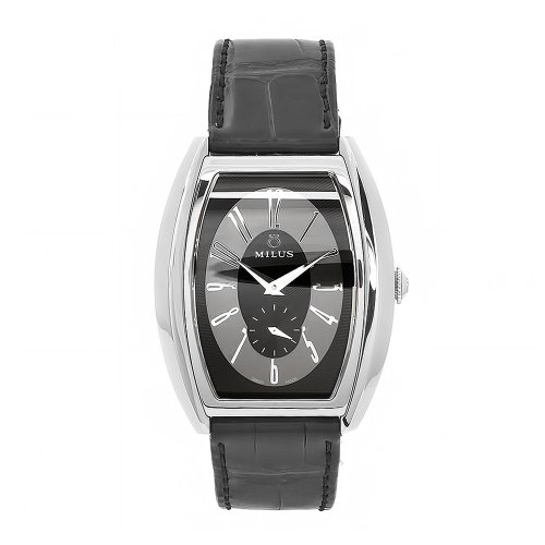This Swiss-made classic timepiece by Milus features a stainless steel case and black leather strap. The black dial includes silvertone numeral markers and a seconds-sweep subdial. The watch has a Swiss automatic movement, scratch-resistant sapphire crystal, and is water resistant to ensure lasting quality.